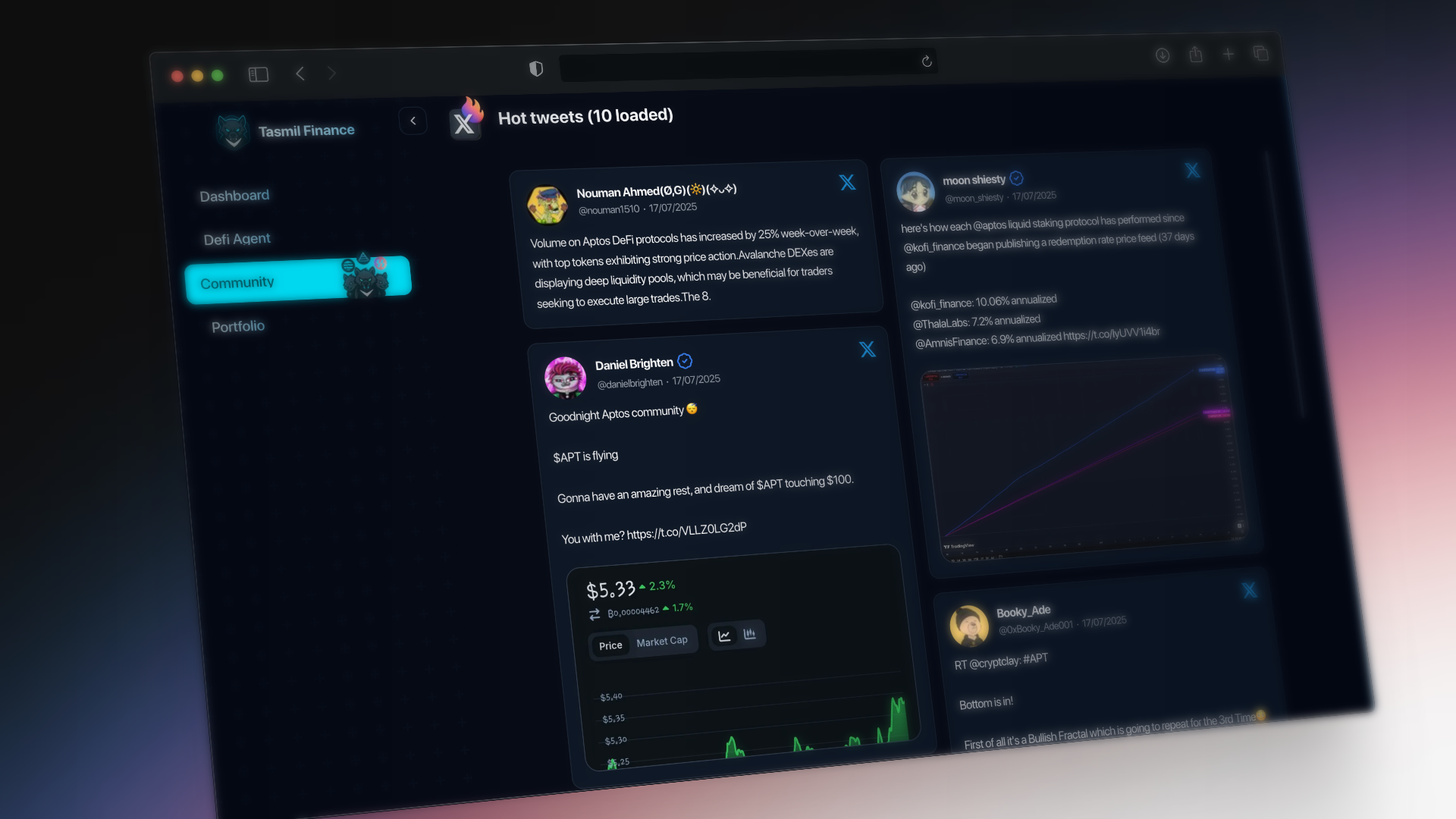Our AI agents act as your personal DeFi assistants. Simply describe what you want to do in natural language - like “swap 100 APTOS for USDC” or “find the best yield farming opportunity” - and the agents handle the complex protocol interactions automatically. They combine real-time on-chain data with social sentiment analysis to make intelligent decisions on your behalf.